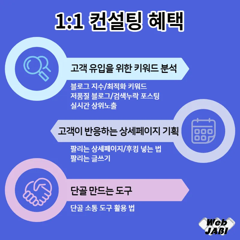 웹자비는 100% 만족 보장 컨설팅을 지향하고 있습니다.